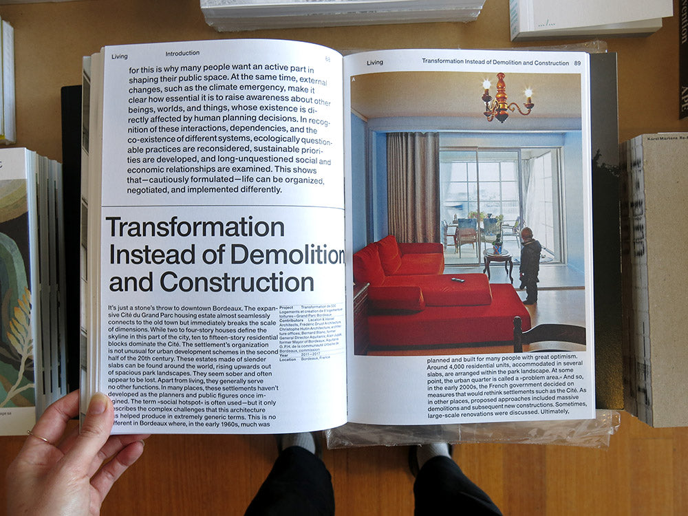 Cities are full of stories—running in parallel, contradictory, overlapping and inseparably linked. Such stories are told in Living the City by referencing various projects from architecture, art, and urban planning. The book aims to show processes and possibilities for action in cities based on more than fifty projects from all over Europe. The publication first looks at urbanites before expanding into emotionally and poetically charged stories that consider very basic activities such as loving, living, moving, working, learning, playing, dreaming, and participating in the city. The book is being published in conjunction with the exhibition of the same name at the former airport in Tempelhof, Berlin, which runs from September to November 2020.