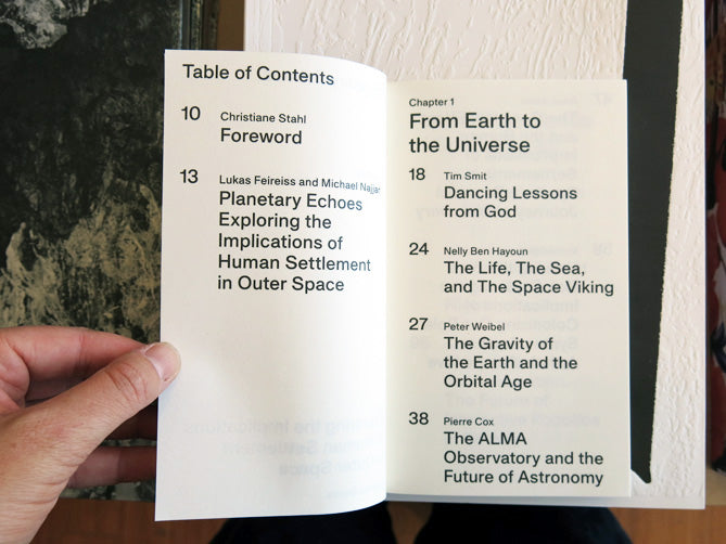 The publication Planetary Echoes explores our imagination of life on other planets in the arts, literature, and sciences at the beginning of the 21st century, attempting to integrate the discourse into the very fabric of society today and connect artistic research and science on an international level. With text by: Buzz Aldrin, Anousheh Ansari, Nelly Ben Hayoun, Thore Bjørnvig, Richard Branson, Clouds Architecture Office, Pierre Cox, Xavier De Kestelier, Lukas Feireiss, Norman Foster, Alexander CT Geppert, Ulrich Köhler, Michael López-Alegría, Greg Lynn, Michael Najjar, Fabian Reimann, Tim Smit, Christiane Stahl, Sethu Vijayakumar, Andy Weir, Frank White, and Peter Weibel. Thanks to Spector Books (Leipzig).