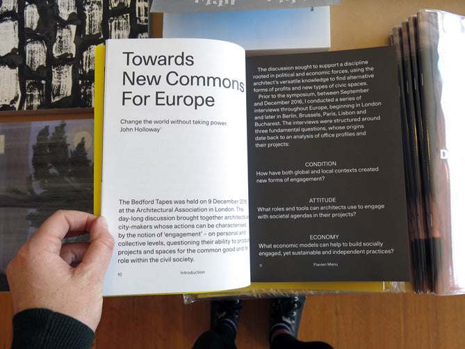 On 9 December 2016 the Architectural Association in London hosted an event called The Bedford Tapes which brought together architects and experts from all over Europe. New Commons for Europe captures the vitality and the doubts of a new generation of architects living at a key moment in the history of the European Union. It questions the role of the profession and the architect’s ability to produce projects and spaces for the common good with an alternative set of resources and profit structure. After the conference a series of interviews were conducted with participants in London, Berlin, Brussels, Paris, Lisbon and Bucharest. The book chronicles both the event and the interviews, which have developed into an ongoing European conversation between architectural figures that takes a new reading of the boundaries of the discipline and its interactions with political, economic, and social factors. Includes texts by: Flavien Menu, Holly Lewis – We Made That, Mathieu Delorme, Aurélien Delchet – Atelier Georges, Alex Axinte, Cristi Borca – Studio BaSAR, Anthony Engi Meacock – Assemble, Jack Self – REAL, Tiago Moita Saraiva – Ateliermob, Markus Bader – Raumlabor. Published by Spector Books (Leipzig).