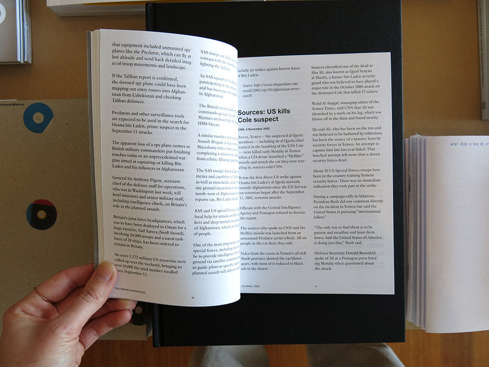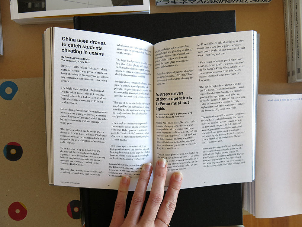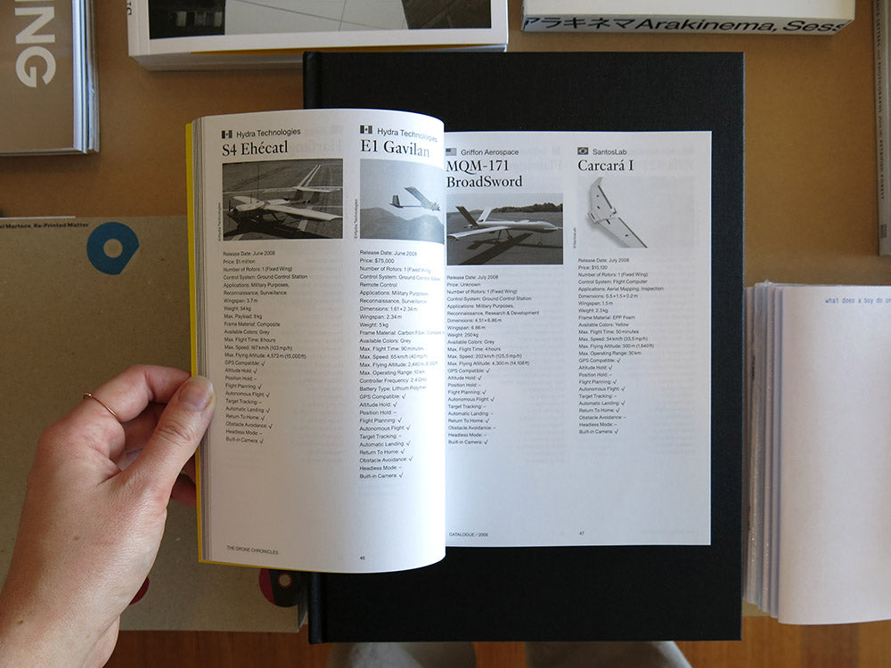 The Drone Chronicles maps the evolution and increasing integration of drones in our society, from the American invasion in Afghanistan in 2001 onwards. The limitless applications of drones and a series of quite extraordinary stories in which they figure are highlighted in this chronicle. All the articles included here derive from different international media outlets, in which ethical and political questions about drone usage are reviewed from a variety of perspectives. The extensive catalogue looks at the production of drones, which is growing exponentially. All the models introduced onto the market between 2001 and 2016—either for commercial or military purposes—are organised by release date and presented along with their technical specifications. The manufacturers are listed by country in the catalogue’s index, proposing a comparative geopolitical reading, equal to that of an atlas.
