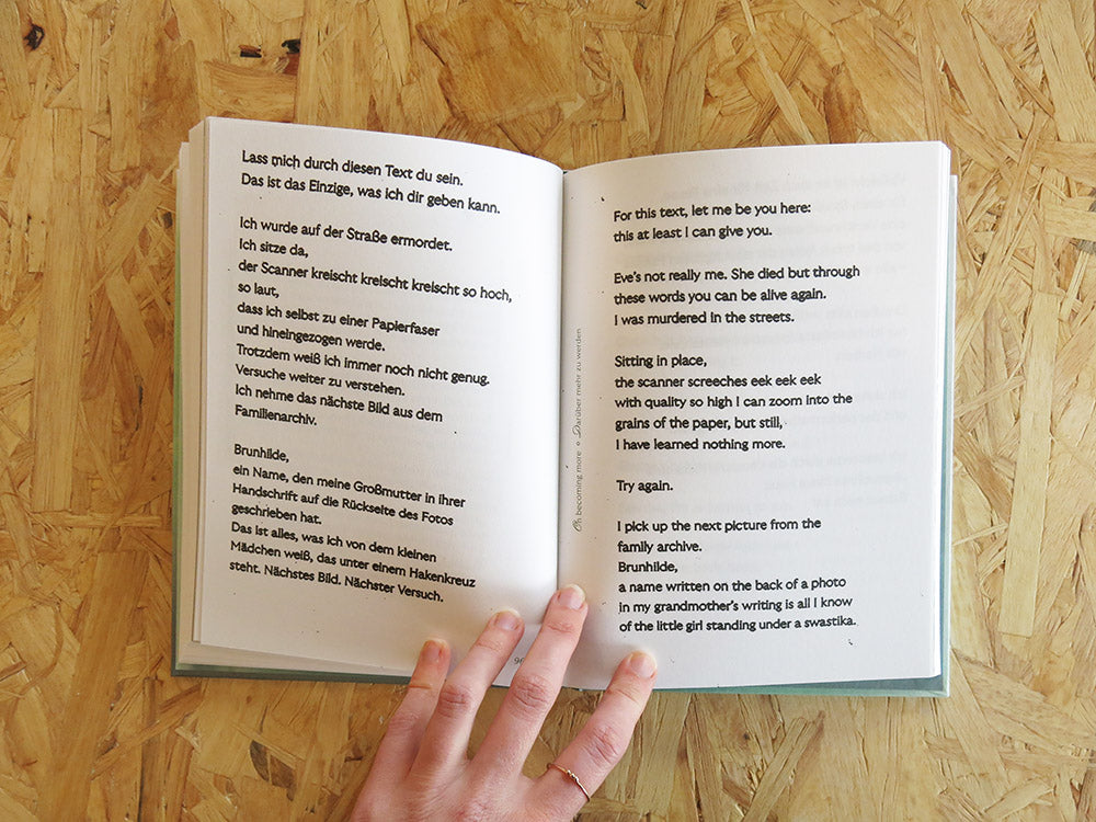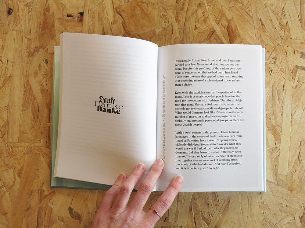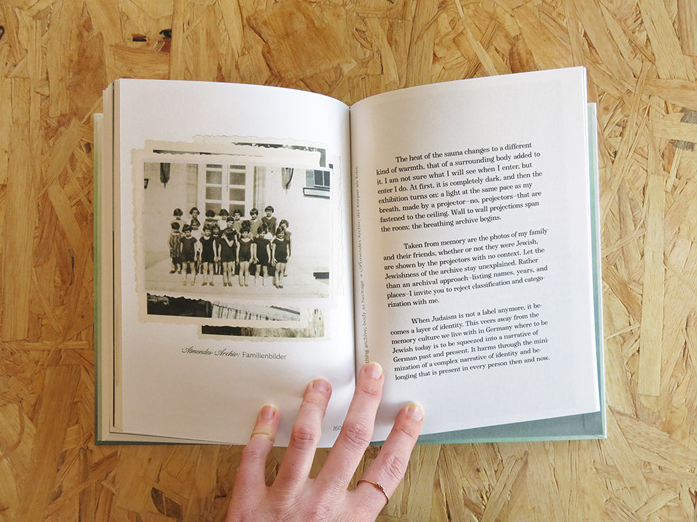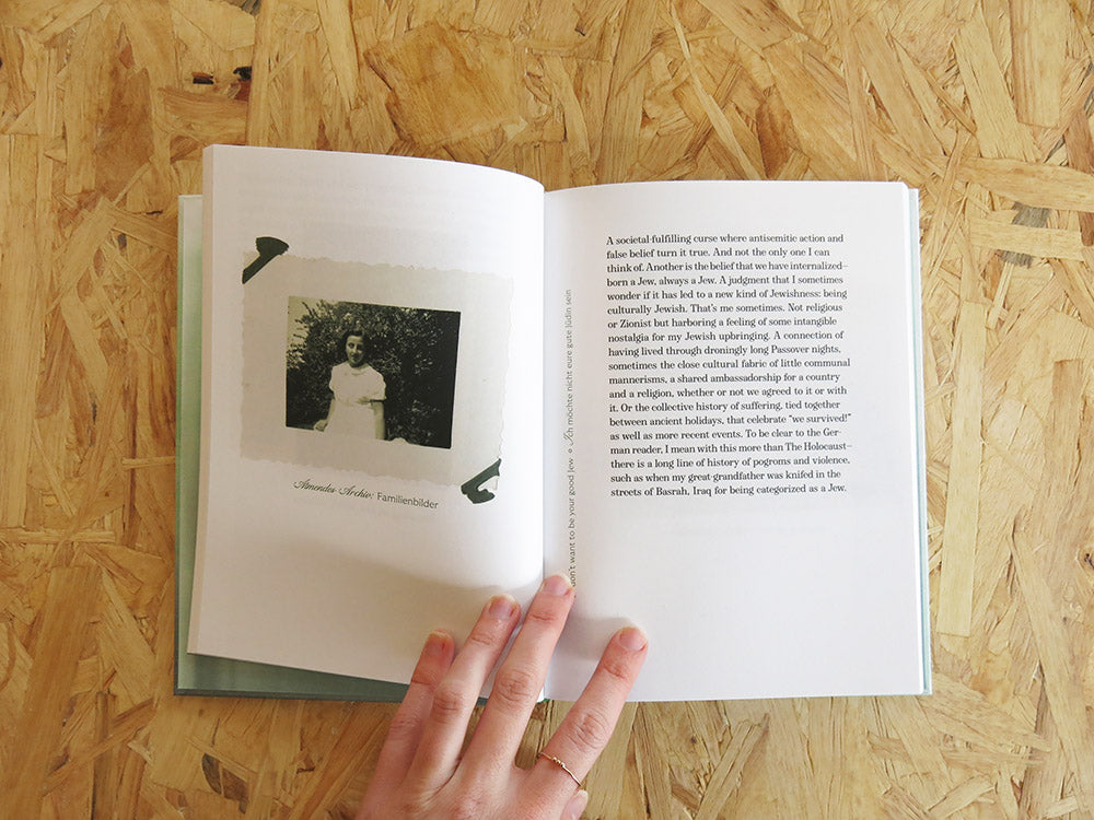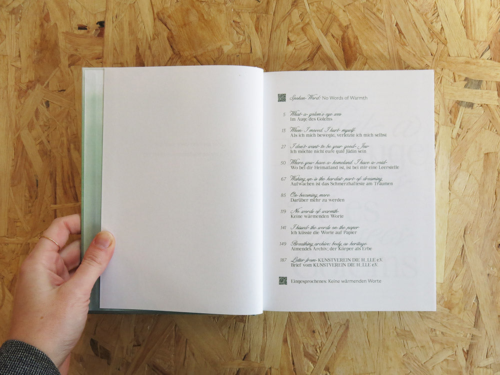 No Words of Warmth / Keine wärmende Worte is a multifaceted and hybrid art book – combining text, sound, and images – that provides a glimpse of a young Jewish woman’s life as an artist in Germany. Associations relating to the roles of sister, daughter, mother, and grandmother are woven together through the eyes of the protagonist to create a cohesive feminist voice that explores the past and its influence on the present. Reality blurs with fantasy in a form of stream-of-consciousness writing that is as true as memory or remembered history. Energised by a process of critical self reflection, this book can be seen as a stand against dehumanisation, and a reflection of Jewish life in Germany today.