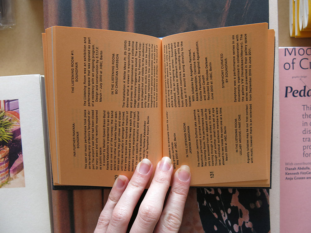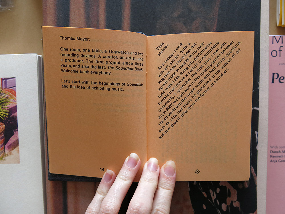 How can one put music on exhibit in an art context? This was the question preoccupying curator Clara Meister, artist and composer Ari Benjamin Meyers, and producer Thomas Mayer when they started Soundfair in Berlin in 2008 — an international exhibition project devoted to the concept of music. Over the next five years, they invited artists and musicians from around the world to develop new works at the interface of art, music, and performance that would abandon traditional notions of concert and exhibition. The publication Soundfair: Exhibiting Music is a documentation of the artistic works that came out of this period. In it the Soundfair founders discuss individual projects and present series of works with the invited artists, who include Janet Cardiff, Olaf Nicolai, and Douglas Gordon.