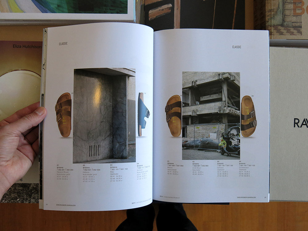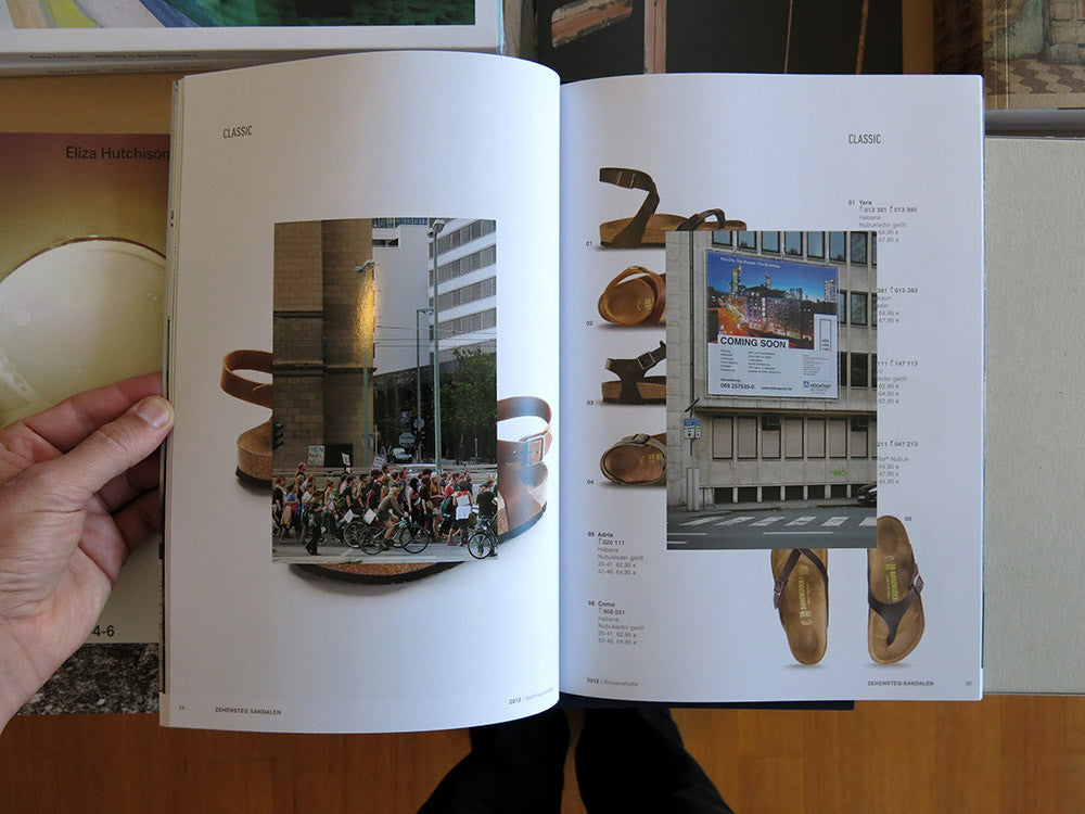 Frankfurt is witnessing construction on a scale unlike anything it has seen in recent years. Stefanie Pretnar observes the alterations to the fabric of the city from a street photographer’s perspective. Armed with her camera, she traverses the urban space on foot. However, her book denies the reader the pleasure of leafing in peace through a series of well-composed images. The artist interweaves her photographs with pages from the catalogue of the Birkenstock company — the book takes its title from the Birkenstock line of shoes “Frankfurt Classic”. In this way she creates relationships between her movement through the city and this shoe brand, which has long since left its ecological niche and is now mixing it as a global player.