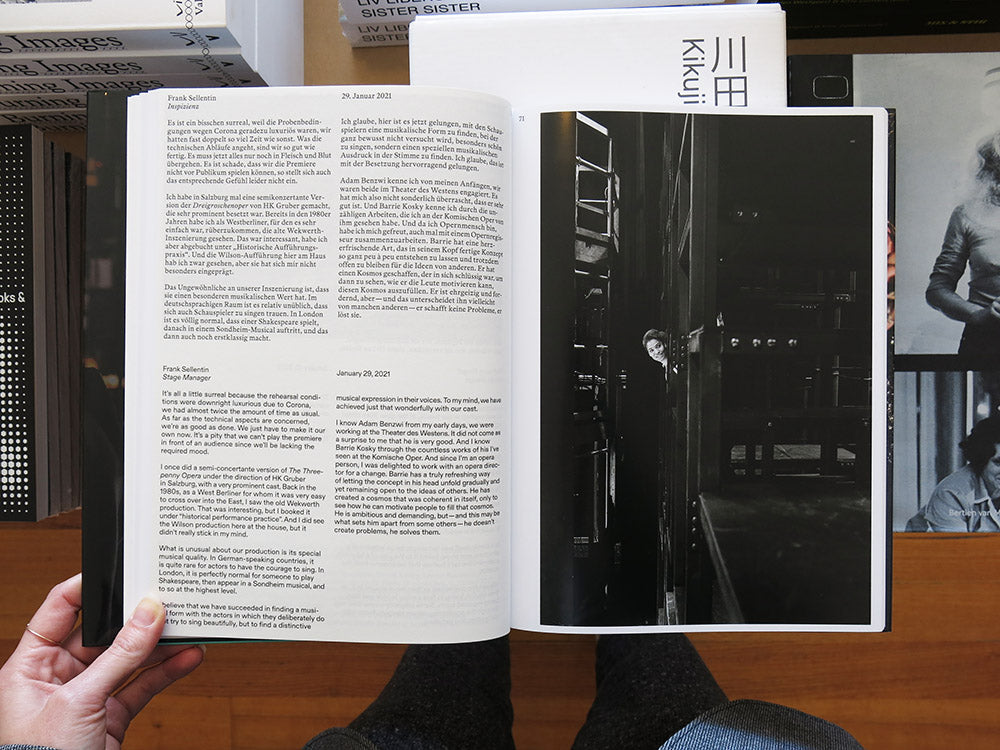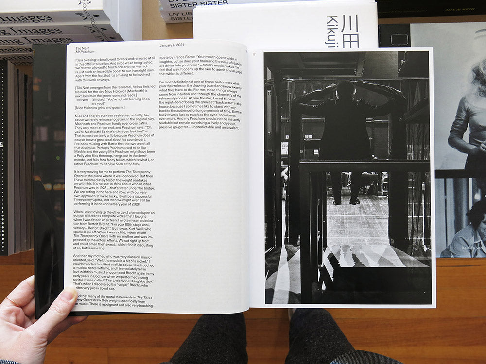 A new Threepenny Opera for Berlin: In spring 2021 a new production of Bertolt Brecht and Kurt Weill’s globally acclaimed musical drama, directed by Barrie Kosky, and conducted by Adam Benzwi, premiered at the Berliner Ensemble, where the piece was first performed in 1928. The internationally sought-after opera director is not interested in putting on a nostalgia-fest revelling in the Golden Twenties but instead wants to give the story a contemporary twist. Writers Marion Brasch and Juri Sternburg and photographer Jörg Brüggemann, who were on hand as the production took shape, give readers an inside view of the work: onstage, front of house, and behind the scenes.