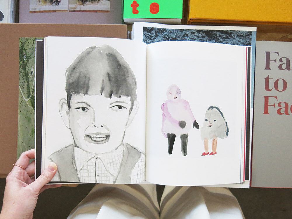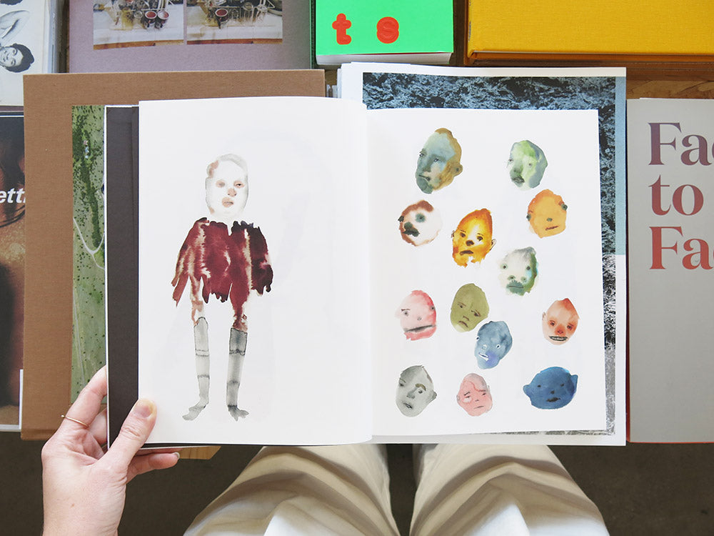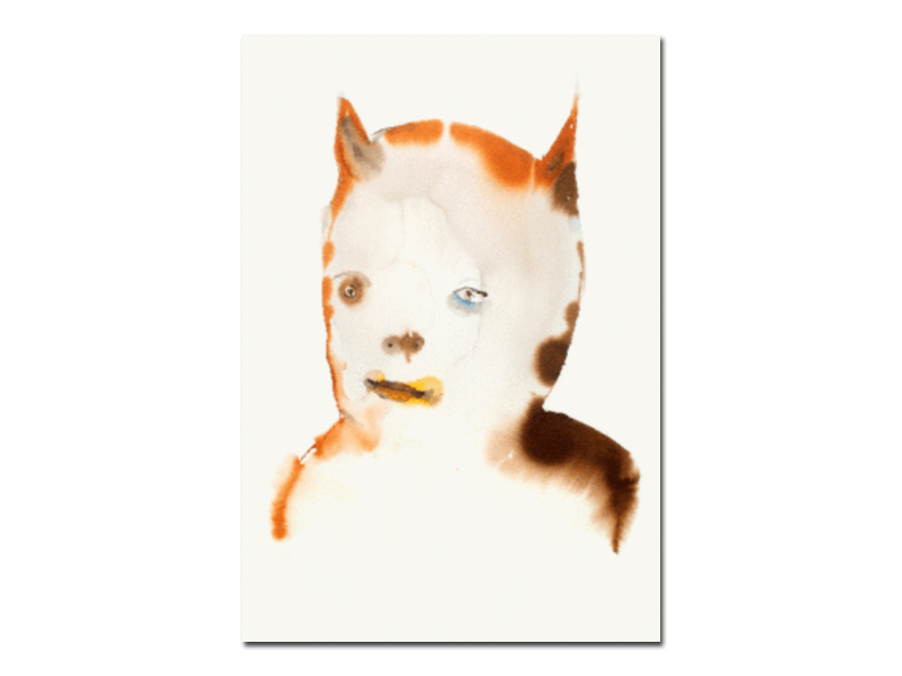 A bold first collection of watercolours on paper and wood by Los Angeles artist Jon Huck (born 1961), At the Drop of a Hat portrays a wild tableau of misfits and weirdos caught in a panoply of odd scenarios and ambivalent moods. There are masks, costumes, recurring props and motifs, and a pervasive fluidity between human and beast. A gleefully deranged comedy animates these bright surfaces – a sense of spontaneous mischief and delight in the brush strokes and blurred paints – but also a longing within the characters themselves, hints of dark melancholy, unsettling private narratives. With a self-taught experimental style both unrestrained and delicately precise, Huck is a nuanced observer of gesture, posture and facial expression, of the personae that conceal us and the flaws that make us real.