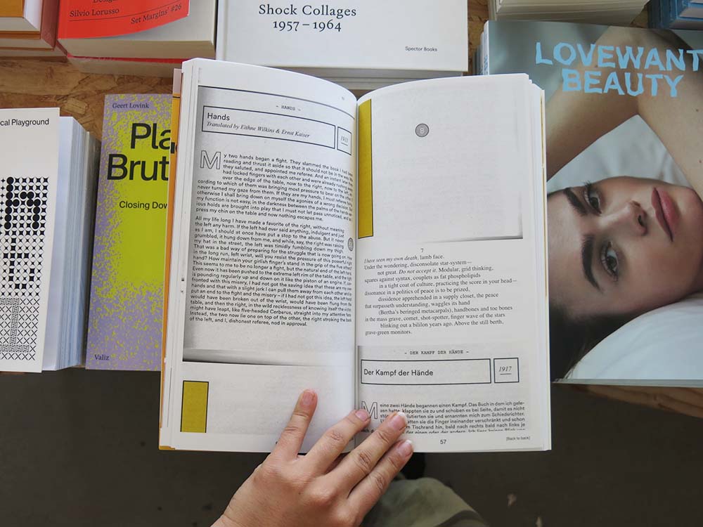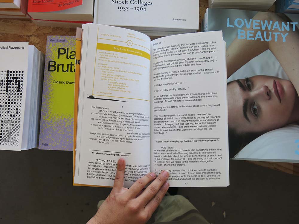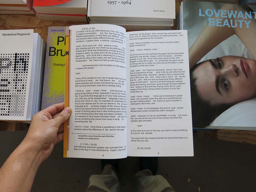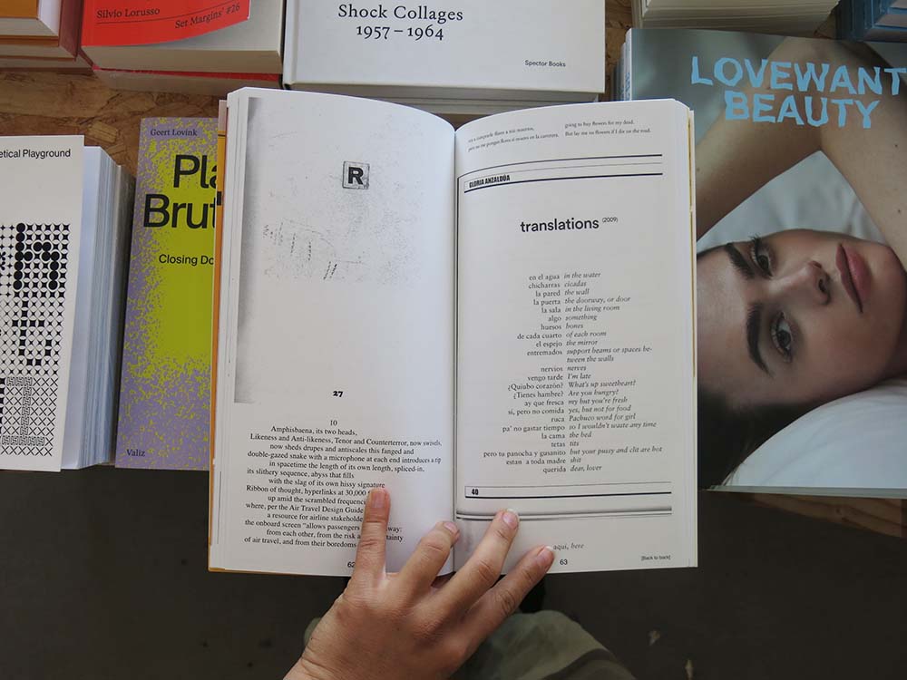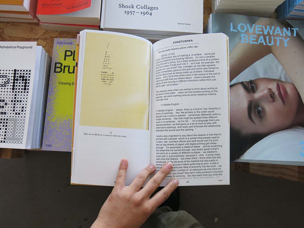 Répondeur is an extensive account of SRC’s practice in collective reading sessions, exhibitions, and textual bootlegging. Imagined as a scroll, with a rhyme structure and typesetting by Will Holder, the book brings together facsimiles of SRC readers, a wide-ranging interview by Alicja Melzacka, new texts by Joyelle McSweeney and Bill Dietz, and visual work and translations by SRC. These discrete elements are interwoven into a complex, shimmering whole, delighting in the ruptures and elisions of one text’s move into the next.