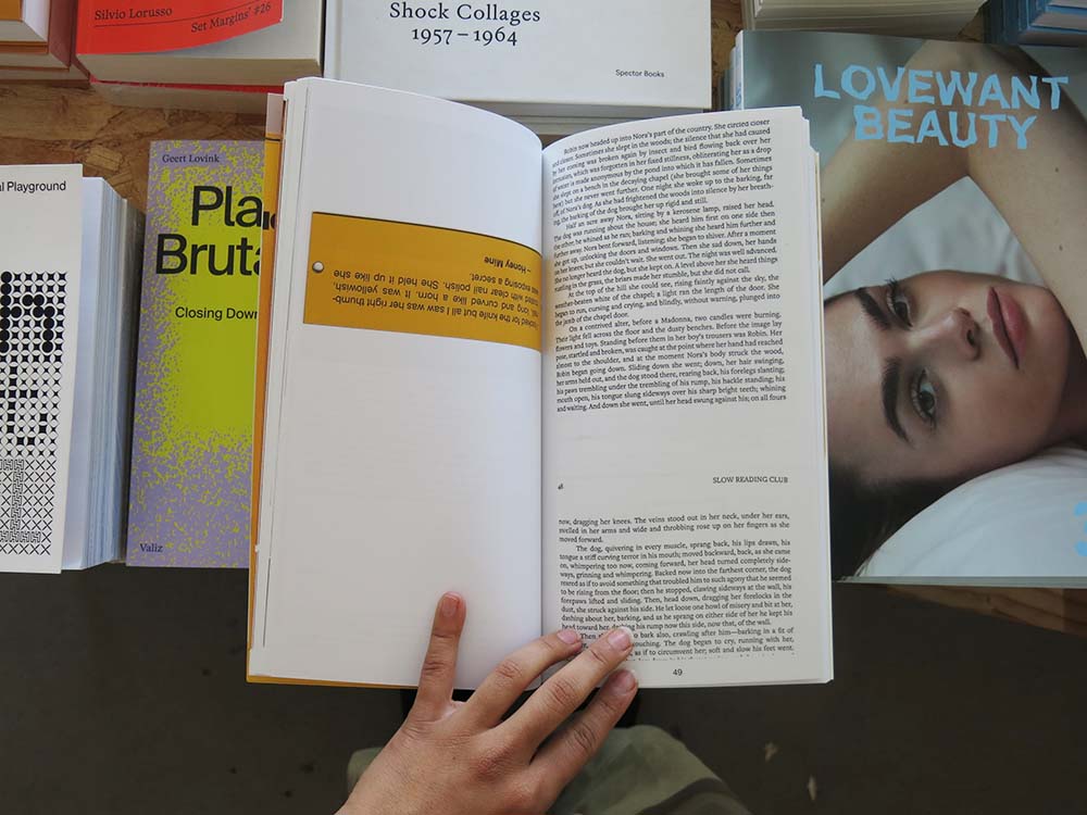 Slow Reading Club (SRC) is a semi-fictional reading group initiated and run by Bryana Fritz and Henry Andersen. Since 2016, in numerous contexts, they have rehearsed alternatives to the kinds of reading they were taught in school, actively suppressing semantic content through strobe lights, strange postures, sociality, and toxins. Operating at the contact zones between reader and text, text and text, reader and reader, they attempt to build a practice from within the unstable space of reading itself.