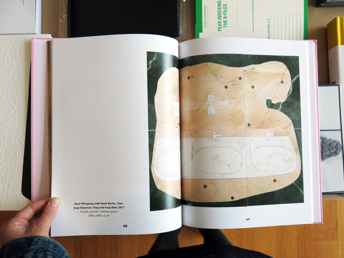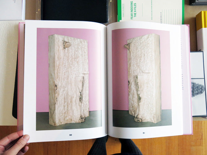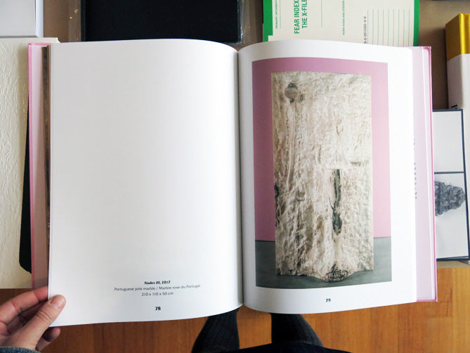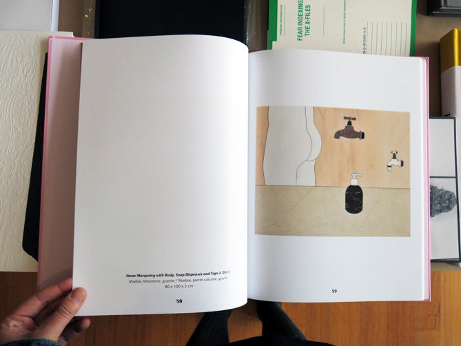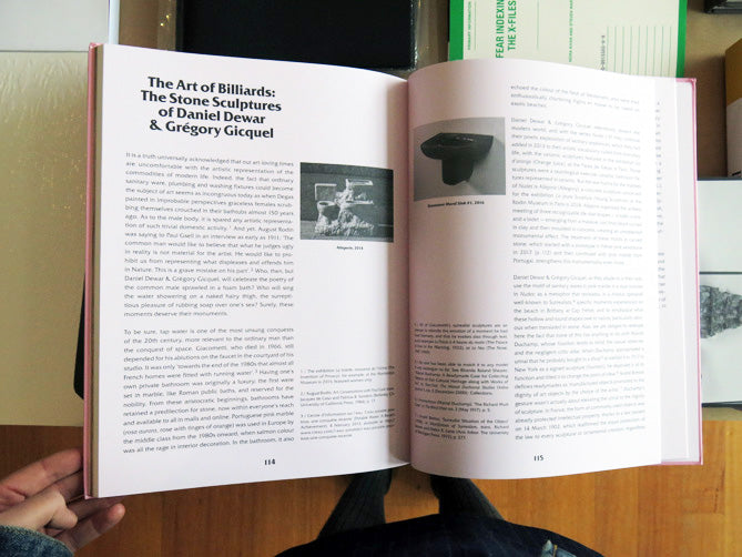 Published by Triangle Books (Brussels) for the exhibition Le nu et la roche at HAB Galerie in Nantes, 9,Daniel Dewar & Gréfory Gicquel continue their exploration of the banal with subject matter such as sanitary appliances and bathroom fixtures. These sculptural forms use materials such as marble, limestone and granite and are an overt and comical tip-of-the-hat to Marcel Duchamp.