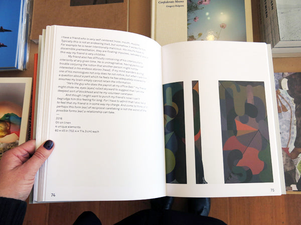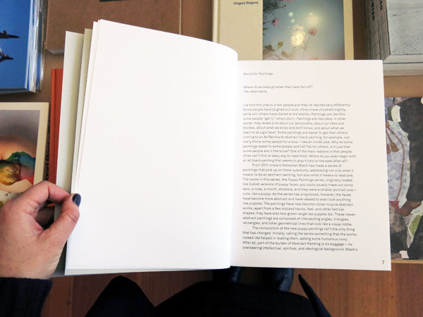 Sebastian Black's recent Puppy Paintings are reproduced in this book alongside the artist’s writings which double as the works titles. In Black's “system" the features of a cartoon puppy face regulate his pictorial and textual output. Through a network of puns, homonyms, calques and cognates these works seek to level writing and painting, thought and action, creation and administration. An essay by Aaron Bogart sorts the implications of Black's loopy analogies. Published by Triangle Books (Brussels).