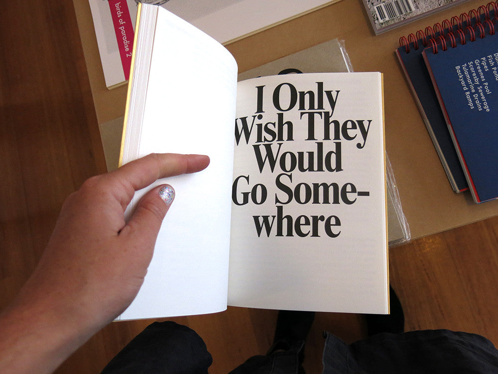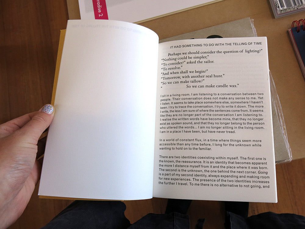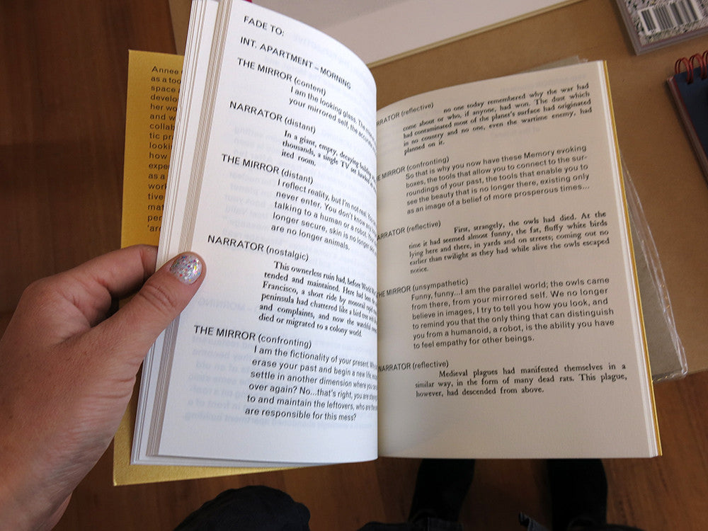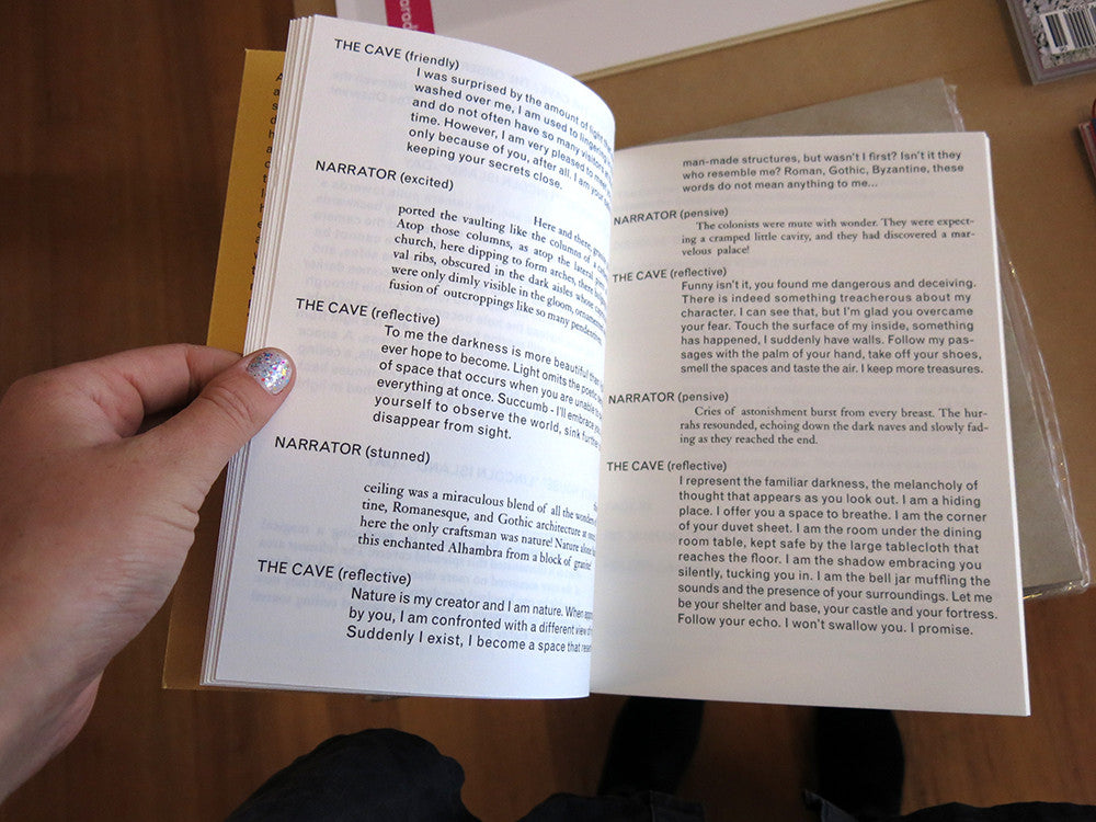 A screenplay in seven acts, the book is based on descriptions of physical spaces extracted from a selection of seven novels. Each act is a conversation between one of the fictional spaces and the narrator or protagonist of the original story. The fictional spaces claim existence, both as individuals and as a collective, inviting the reader on a journey, from the naturally created cave to the man-made dystopia. Published by Onomatopee (Eindhoven).