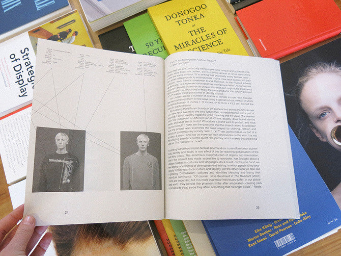 Elisa van Joolen's 11" x 17" Reader is an ongoing project that examines and challenges the fashion industry’s prevailing value systems and proposes new methods of production. The project began in 2013 with a series of conversations with representatives of various fashion brands including G-Star, O’Neill,gsus sindustries, Rockwell by Parra, Converse,moniquevanheist and Nike. These companies then contributed by donating clothing and footwear, which van Joolen has then complemented with pieces of second-hand and no-brand clothing, applying a process of cutting out and reconstructing to become11”x17” Sweaters and Invert Footwear. 11”x17”creates a network, uniting different categories of clothing and different values within fashion – an eclectic mixture of mid-market, second-hand and high-end items. Beautifully designed and published by official Perimeter pals Onomatopee (Eindhoven).