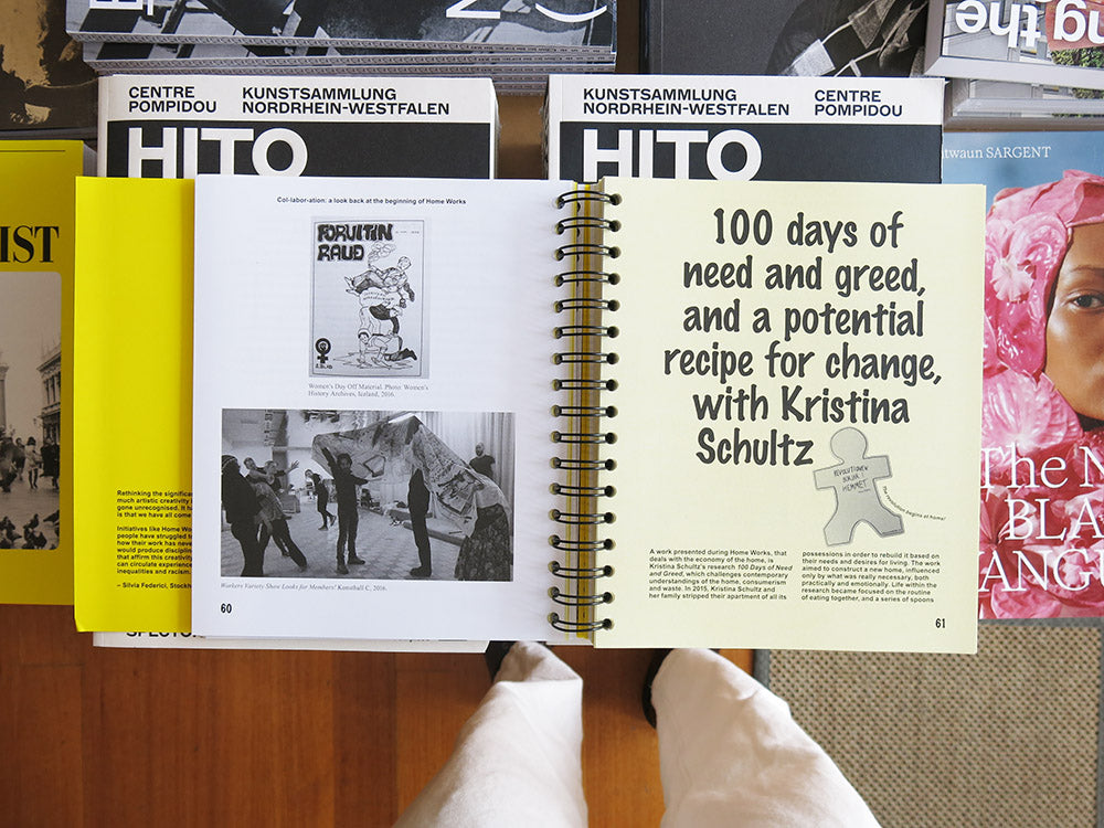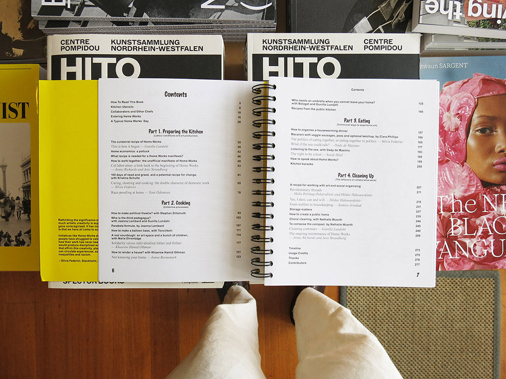 (Home Works) – A Cooking Book: Recipes for Organising with Art and Domestic Work, expands on cooking with art and food as a process for coming together and building collectivity. The book highlights the art and politics of eating together through a number of artistic, curatorial and tasty dinner recipes. Recipes that nourish and nurture conversations around domestic labour, collaborative practices and feminist politics, expanded upon through a series of essays and interviews.
