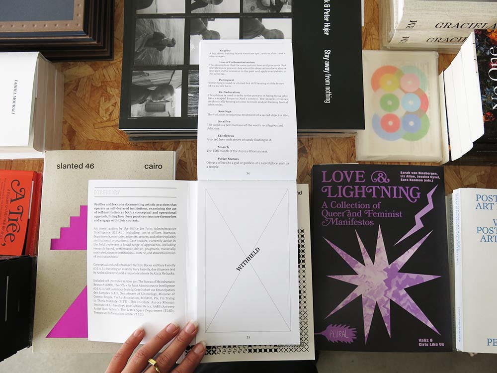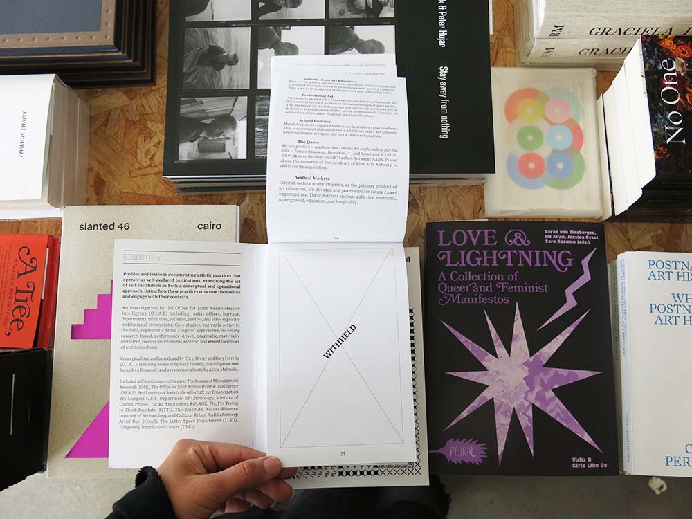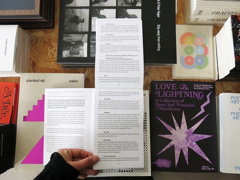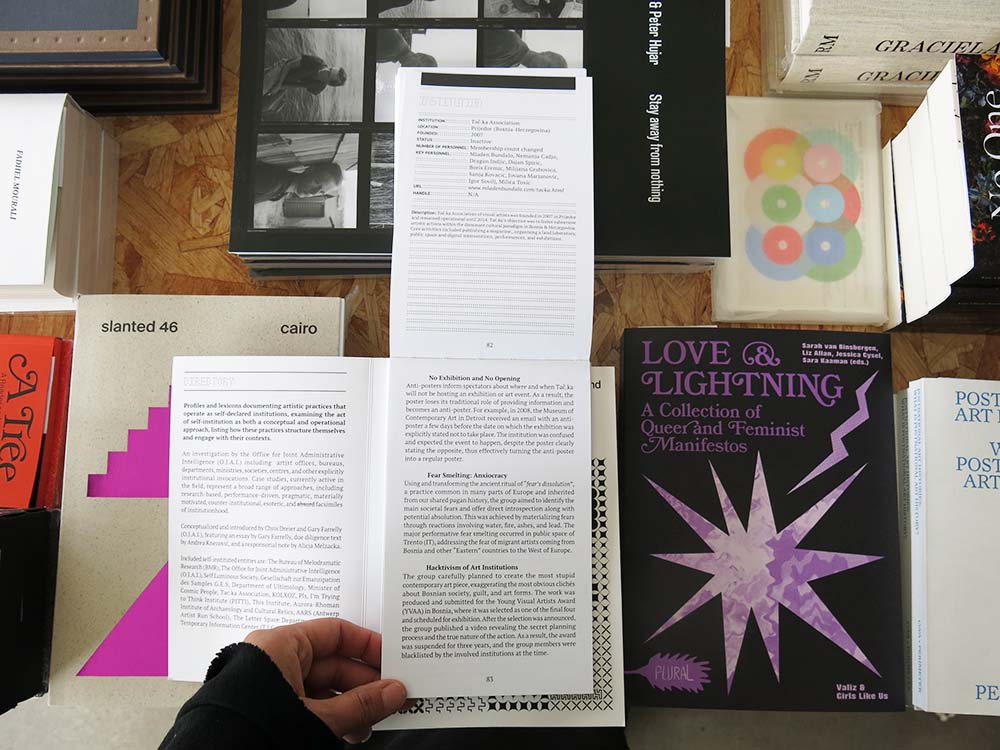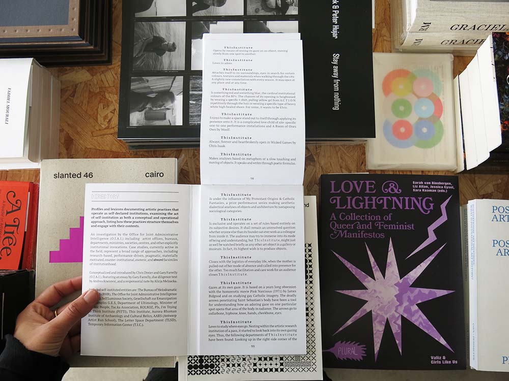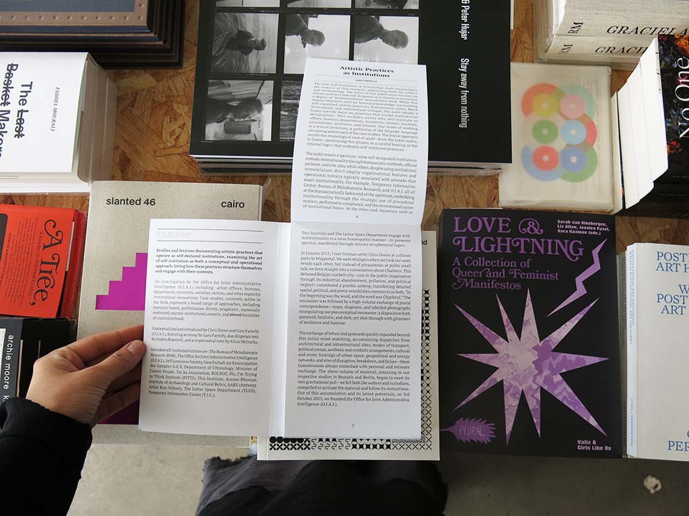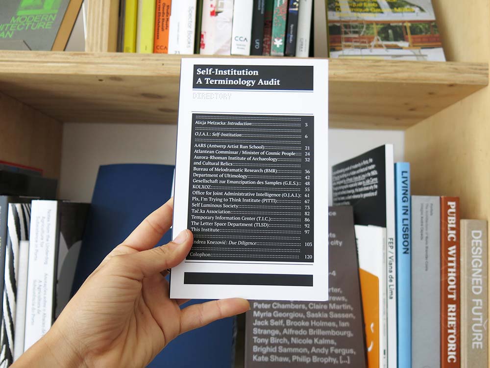 The publication was conceptualised and introduced by Chris Dreier and Gary Farrelly (O.J.A.I.), featuring an essay by Gary Farrelly, due diligence text by Andrea Knezović, and a responsorial note by Alicja Melzacka. Included self-instituted entities are: The Bureau of Melodramatic Research (BMR), The Office for Joint Administrative Intelligence (O.J.A.I.), Self Luminous Society, Gesellschaft zur Emanzipation des Samples G.E.S, Department of Ultimology, Minister of Cosmic People, Tac.ka Association, KOLXOZ, Pls, I’m Trying to Think Institute (PITTI), This Institute, Aurora-Rhoman Institute of Archaeology and Cultural Relics, AARS (Antwerp Artist Run School), The Letter Space Department (TLSD), Temporary Information Center (T.I.C.).